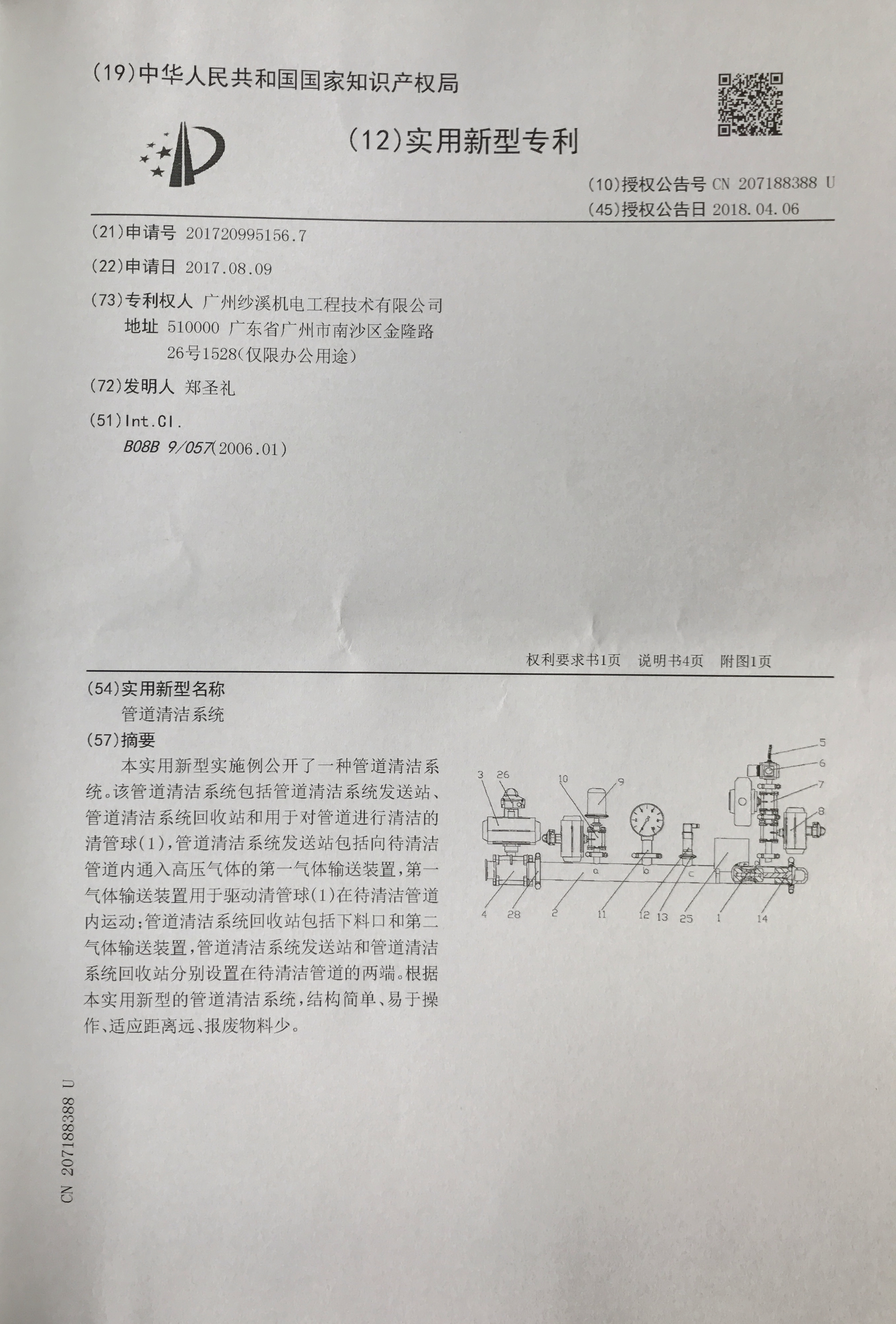 在全體員工的持續(xù)努力和用戶的信任下;公司于2018年4月6日取得國家知識產(chǎn)權局頒發(fā)的管道清潔系統(tǒng)實用新型專利證書。